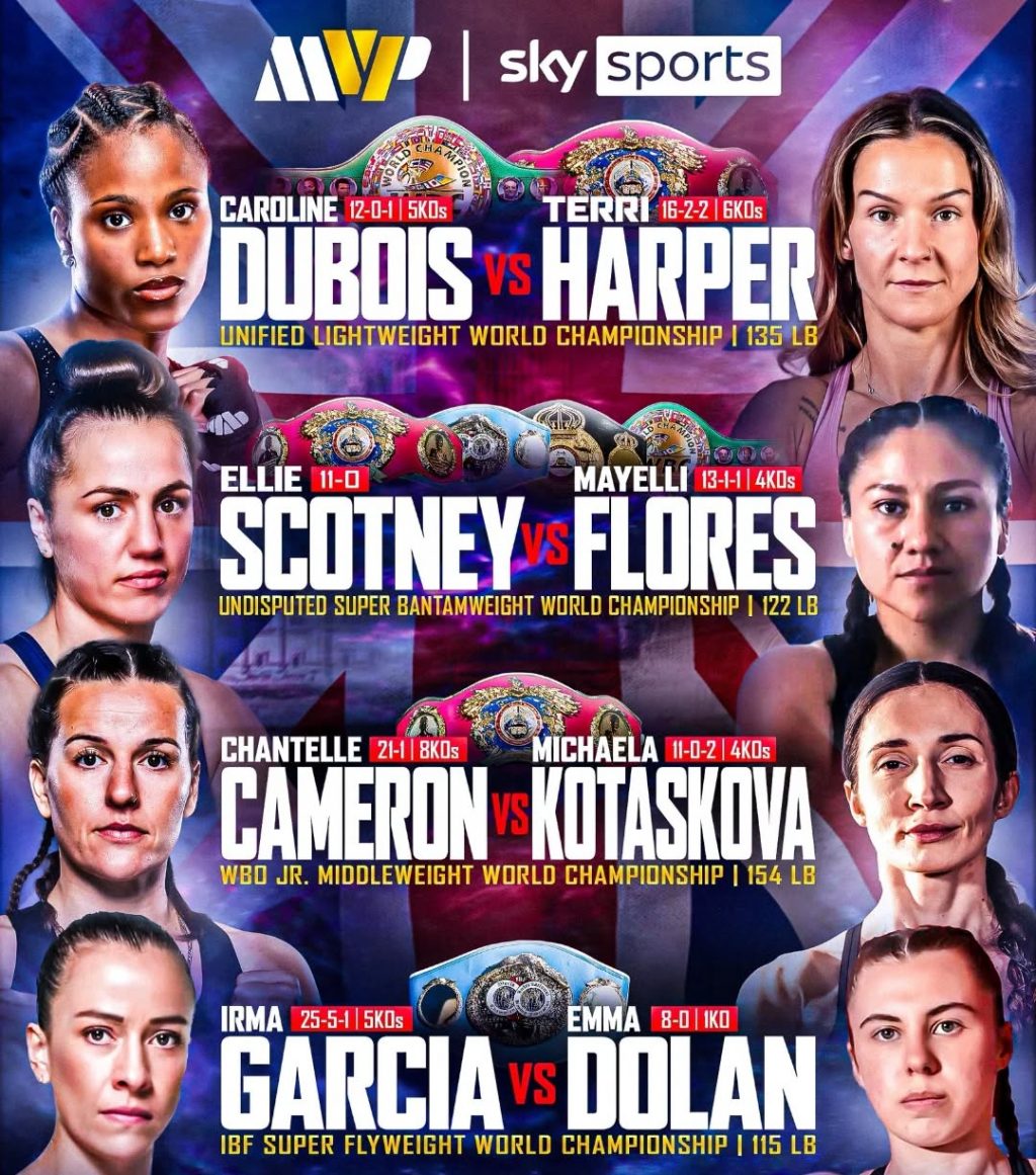En el combate principal, Caroline “Sweet Caroline” Dubois expondrá su título mundial ligero frente a la experimentada Terri Harper. Dubois, invicta, atraviesa un momento de plena madurez: campeona consolidada, con tres defensas exitosas y una proyección que la posiciona como una de las figuras emergentes del boxeo británico. Su ascenso fue meteórico desde su debut en 2022, coronado con el cinturón interino en 2024 y luego elevado a campeonato absoluto.